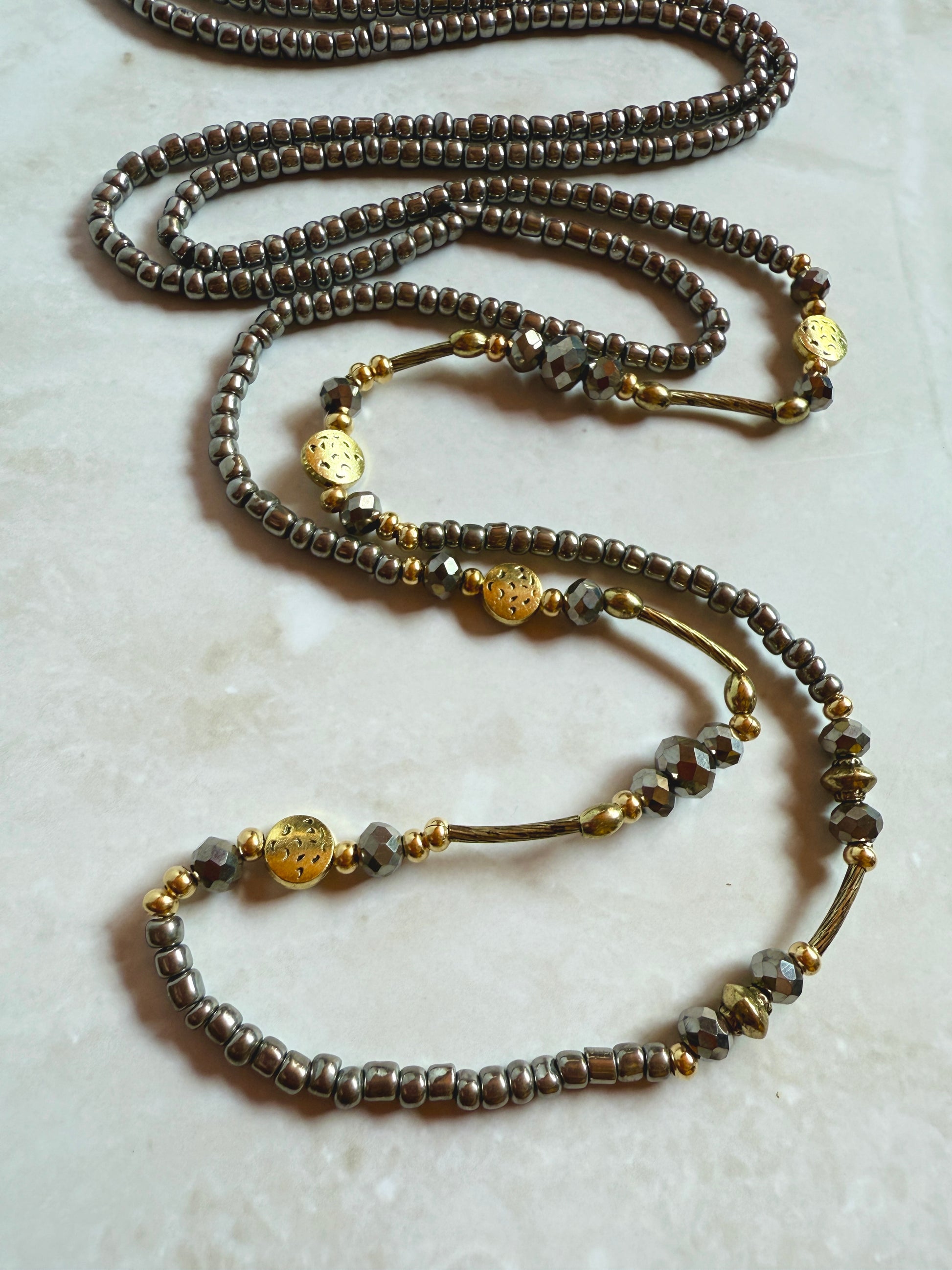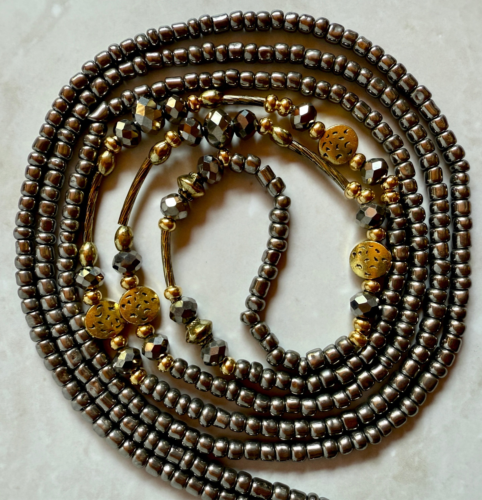 Wrap yourself in the timeless charm of Moonlit Elegance waist beads. This design blends metallic gray: a symbol of wisdom and resilience with radiant gold, representing abundance and success. Together, they honor your strength and brilliance. Handcrafted with love, these beads celebrate your journey of transformation and self-love.